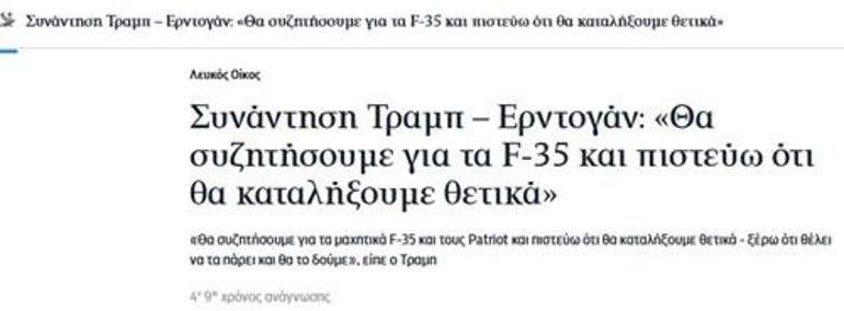 Yunan gazetesi Kathimerini, görüşmede savunma sanayinin merkezde olduğunu ifade etti. Haberde, Trump’ın “F-35’ler ve Patriot’lar hakkında konuşacağız ve olumlu bir sonuca varacağımızı düşünüyorum” dediği belirtildi. Trump’ın, Erdoğan’ı “güçlü fikirleri olan bir adam” olarak tanımladığı ve kendisini sevdiğini eklediği kaydedildi.
